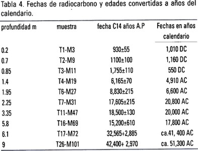 Con el propósito de comparar edades de carbono catorce con estudios de otras cuencas aledañas, se considera necesario como en otros estudios recientes (Fritz et al., 2001) utilizar los datos de acuerdo a fechas C14 antes del presente, sin embargo en la Tabla 4 se indica la edad de acuerdo al calendario convertida según la descripción de Bard et al., 1993 y Stuiver y Reimer 1993.