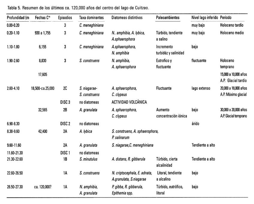 En resumen existen semejanzas entre el registro de diatomeas de los últimos ca. 35,000 años en el Lago de Pátzcuaro (Bradbury, 2000) con el de Cuitzeo, principalmente entre ca. 25,000 y 13,000 años A.P, entre ca.13,000 y 10,000 y a los ca.5,000 años A. P.