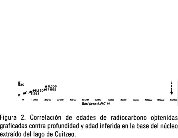 Con la finalidad de tener más claridad en la variación de las edades en los sedimentos, los resultados de los fechamientos se colocaron en una gráfica profundidad-tiempo en ella se observa un incremento en edad conforme se incrementa la profundidad. Utilizando la recta obtenida para estos datos, podemos sugerir una edad aproximada de 120,000 años en la parte terminal del núcleo (Fig. 2).