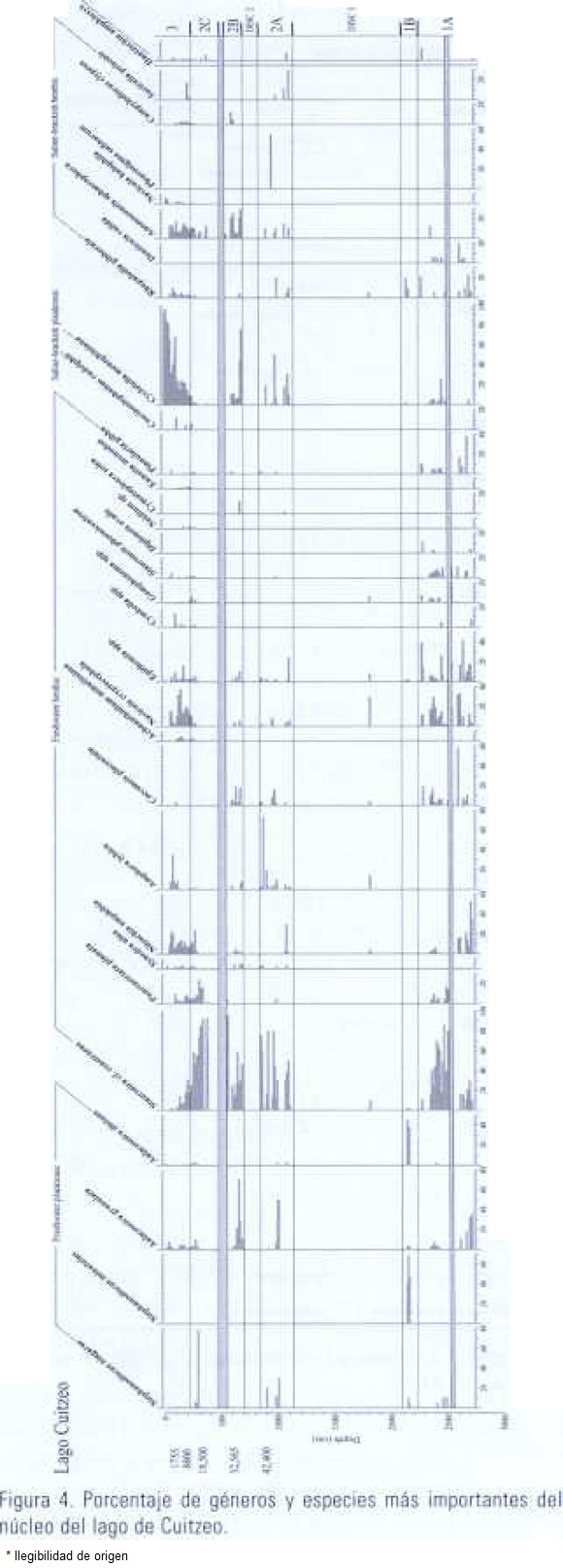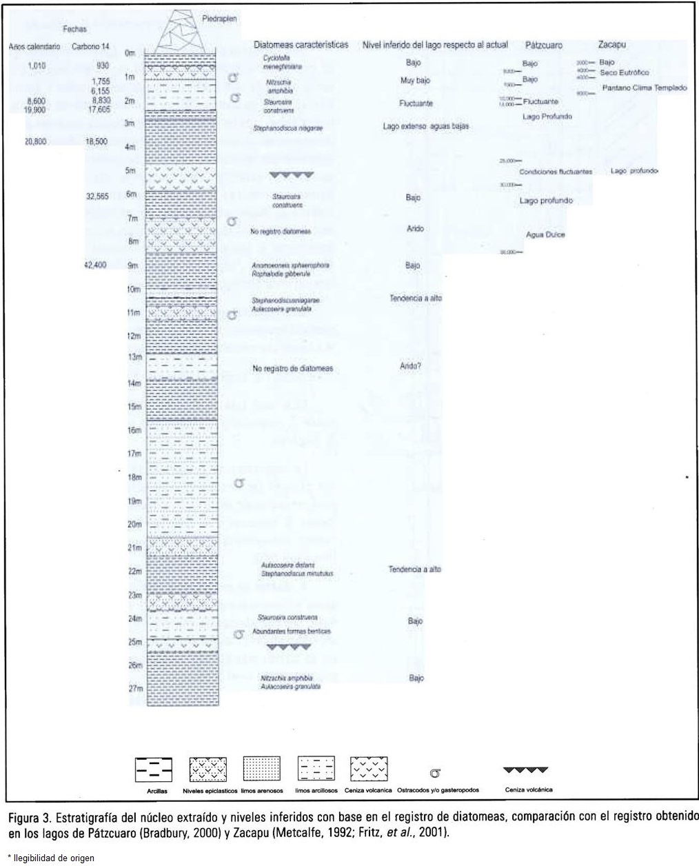 Cuencas limítrofes a Cuitzeo comprenden la de Zacapu, que ha sido ampliamente estudiada a partir del último máximo glacial (ca. 25,000 años) hasta el presente (Metcalfe, 1992 y la de Pátzcuaro Bradbury (2000) cuyo registro se extiende hasta el intervalo pleniglacial-tardiglacial. Comparando este rango de tiempo que abarca los primeros metros del registro del núcleo de Cuitzeo (Fig. 3) se observa que entre 25,000 y 10,000 años A.P. (intervalo pleniglacial y tardo glacial), el lago de Pátzcuaro se caracteriza por Aulacoseira y Stephanodiscus que indican condiciones frías y niveles lacustres profundos (Bradbury, 2000). Altos porcentajes de Staurosira spp. en el lago de Pátzcuaro entre 13,000 y 10,000 años A.P. sugieren bajos niveles lacustres. Sin embargo, la presencia de S. oregonicus y A. islandica indica ingresos de humedad hacia la cuenca (Bradbury 2000).