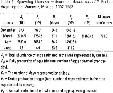 Given the importance of A. mitchilli due to its abundance, short life cycle, massive spawning and trophic role within estuarine-lagoon systems, the objectives of this study were to determine the abundance of this species' eggs and to estimate its spawning biomass in Pueblo Viejo Lagoon.