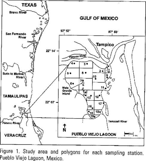 Pueblo Viejo Lagoon is located in the northern area of the state of Veracruz, between 22° 05' and 22° 13' N, and 97° 50' and 98° 00' W. It communicates with the Panuco river to the north through a channel, approximately 10 km away from its mouth into the Gulf of Mexico, and with the Tamacuil river to the south (Fig. 1).