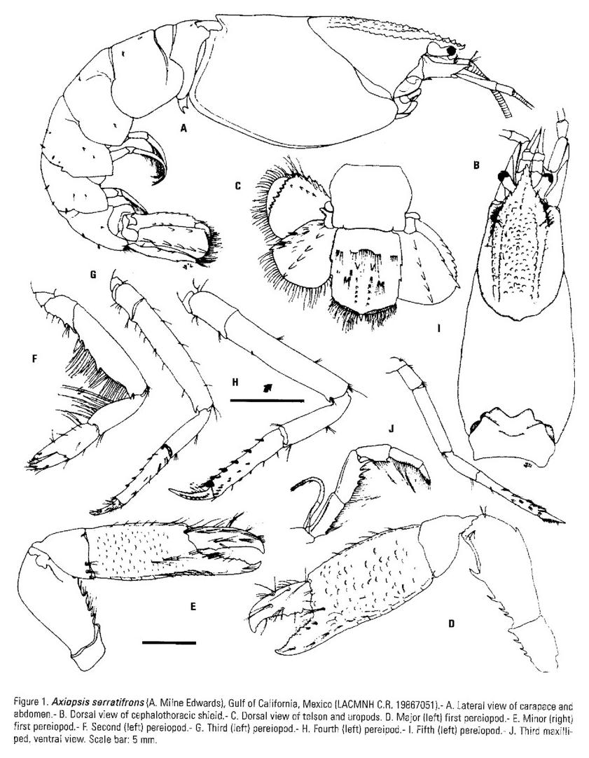 The examination of a specimen of Axiidae received on loan from the Allan Hancok Foundation and its comparison with material from the Indo-Pacific previously cited in literature (Sakai and de Saint Laurent, 1989), and with the redescription of this species (Kensley, 1980; Lemaitre and Ramos, 1992) indicates that A. serratifrons is also present in the Mexican Pacific.