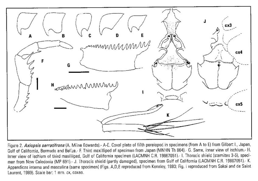 Since the discovery of A. serratifrons in the western Atlantic, the family Axiidae has been reviewed (Sakai and the Saint Laurent, 1989). An illustration and a description of the 4th and 5th thoracic sternites in A. serratifrons were provided, and were used as an important diagnostic characteristic at generic level.