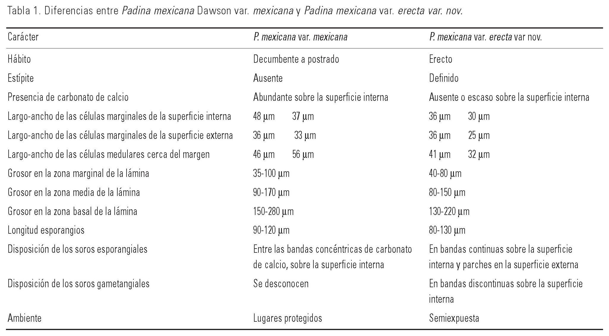 Dawson (1944) describió Padina mexicana, e hizo hincapié en el hábito postrado como un carácter de mayor peso para separarla de P. crispata Thivy y P. gymnospora (Kützing) Sonder, de la misma manera que Thivy (1945). A diferencia de Dawson (1944), Mateo-Cid et al. (2000), se refieren a P. mexicana, como un talo postrado y raramente erecto, es decir incluyendo los dos hábitos en la misma especie, con tres o cuatro capas de células medulares, con oogonios, pero no refieren a los esporangios ni a los anteridios. Tomando en cuenta que en el género Padina, es mucho más común la presencia de la generación esporofítica que la gametofítica, es muy probable que lo que reportan sean esporofitos con esporangios inmaduros en lugar de gametofitos femeninos con oogonios, pues de lo contrario si fueran oogonios también deberían haber encontrado gametofitos masculinos.