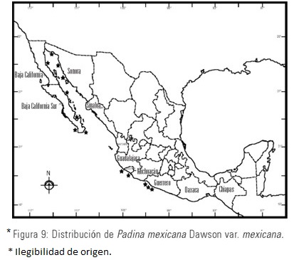 Dawson (1944) describió Padina mexicana, para Isla Turner, cerca de I. Tiburón en el mar de Cortés. Esta especie se caracteriza por presentar fronda complanada, resupinada y anchamente flabelada, sin estípite definido. Las láminas se adhieren al sustrato mediante rizinas, lo que le da el hábito postrado, a diferencia de las otras especies del género que presentan talos erectos. En cuanto a caracteres reproductivos, Dawson sólo mencionó la ubicación de los soros esporangiales sobre la superficie superior de la lámina, alternando con bandas de carbonato de calcio. De las estructuras reproductoras sexuales, oogonios y anteridios, no se tenía conocimiento.