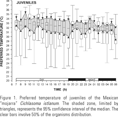 The preferred temperature median value of the juvenile "mojarra" at the day phase was of 32.5ºC; for the night phase was of 32.0ºC. No significant differences (P > 0.05) in the temperature preference of the juveniles during both phases of the cycle were assessed. Final thermal preferendum of juvenile of C. istlanum had a range of 30.5-33.7ºC with a median value of 32.6ºC (Figure 1). The preferred temperature of the adult during day and night phase was 31.0 and 30.2ºC respectively. There were no significant differences (P > 0.05) in the preferred temperature of the adults between day and night phases of the cycle. The preferred temperature range of the adult "mojarra" was in the 29.2 to 32.6ºC interval with a median value of 30.5ºC (Figure 2).