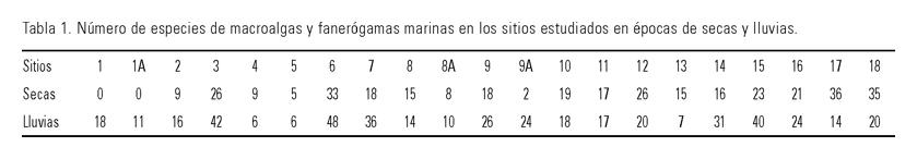 El número total de especies de macroalgas y fanerógamas marinas por sitio osciló entre 0 (sitios 1, 1A y 9A en secas) y 48 (sitio 6 en lluvias). Se destacaron los sitios que tuvieron un número de especies mayor de 30 (6, 17 y 18 en secas, y la 3, 6, 7, 14 y 15 en lluvias) (Tabla 1). De éstos, 3, 17 y 18 se encuentran ubicados en la zona exterior (norte) de los cayos y de la península Hicacos, con un alto intercambio con aguas oceánicas, mientras que los sitios 6, 7 y 14 están en la porción norte de la Bahía de Cárdenas (Fig. 1).