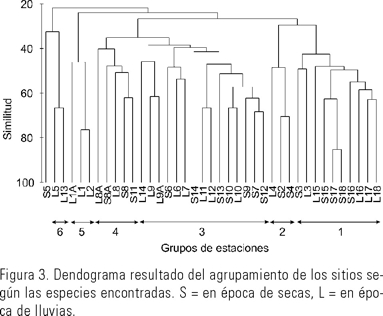 El análisis de agrupamiento dio lugar a seis grupos de sitios, con excepción del sitio 5 en secas que quedó fuera de algún grupo (Fig. 3). Las especies también formaron grupos mediante el análisis de la matriz inversa, los que resultaron más difíciles de separar por la cantidad de especies presentes, y por los bajos valores de similitud encontrados.