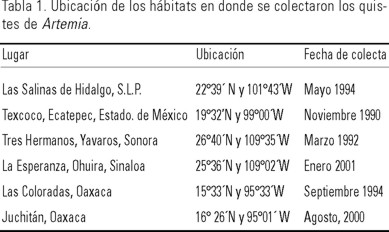 Los quistes de Artemia utilizados fueron colectados en los lugares que se mencionan en la Tabla 1.