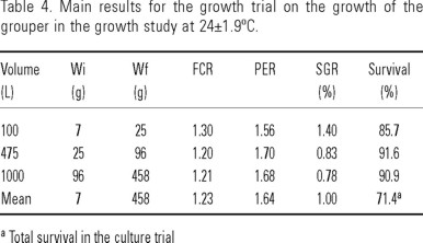 Groupers, and other fish species, could have different growth depending on the environmental conditions of their habitat. Wild dusky grouper, spent approximately 3.3 years to attain 400 g (Bruslé, 1985), and other groupers spent from 1 to 2 years for obtaining the same size (Manooch & Haimovici, 1978; Salazar & Sanchez, 1988). Due to this fact, growth of wild groupers could be considered slow for aquaculture purposes. However, in culture conditions, the right management of the physical parameters along with the knowledge of the nutritional requirements is the main key to obtain a faster growth of fish.