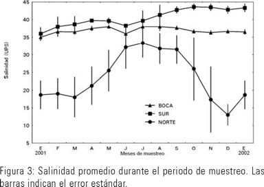La temperatura promedio del agua en La Bocanita, granja Zona Norte y granja Zona Sur fluctuó entre los 10 y los 30ºC. Los máximos fueron de junio a octubre y los mínimos de noviembre a abril (Fig. 2). La salinidad promedio del agua fluctuó entre las 10 y las 40 ups. Los máximos fueron de junio a octubre y los mínimos de noviembre a abril. La granja norte recibe descargas de agua dulce de drenes agrícolas, lo cual es evidente por presentar menor salinidad y mayor fluctuación de la misma que en los otros puntos de muestreo (Fig. 3). El oxígeno disuelto fluctuó entre los 3 a 10 mg/l. Los máximos fueron de noviembre a marzo y los mínimos de mayo a octubre (Fig. 4).