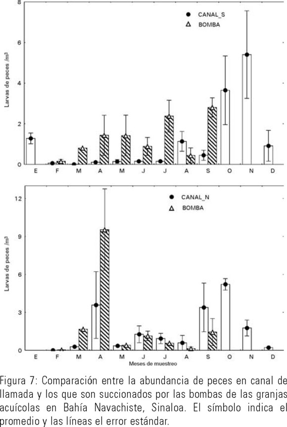 Los máximos de abundancia de peces encontrados en Navachiste, Sinaloa, coinciden con los periodos de llenado de las granjas de camarón, el primer ciclo inicia en febrero y marzo y el segundo de junio a agosto. La cantidad de organismos zooplanctónicos succionados por las bombas de la zona norte y sur está directamente relacionada con la densidad en las zonas adyacentes. Lo que hace suponer el efecto aditivo de la captura y muerte de postlarvas en el bombeo de las granjas de camarón.