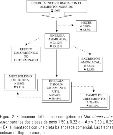 En la figura 2 se presenta esquemáticamente el balance energético de C. estor estor. La energía potencial de crecimiento fue 45 % mayor en la clase de peso B, no obstante los valores relativos a la energía del alimento ingerido fueron similares, independientemente del peso corporal.