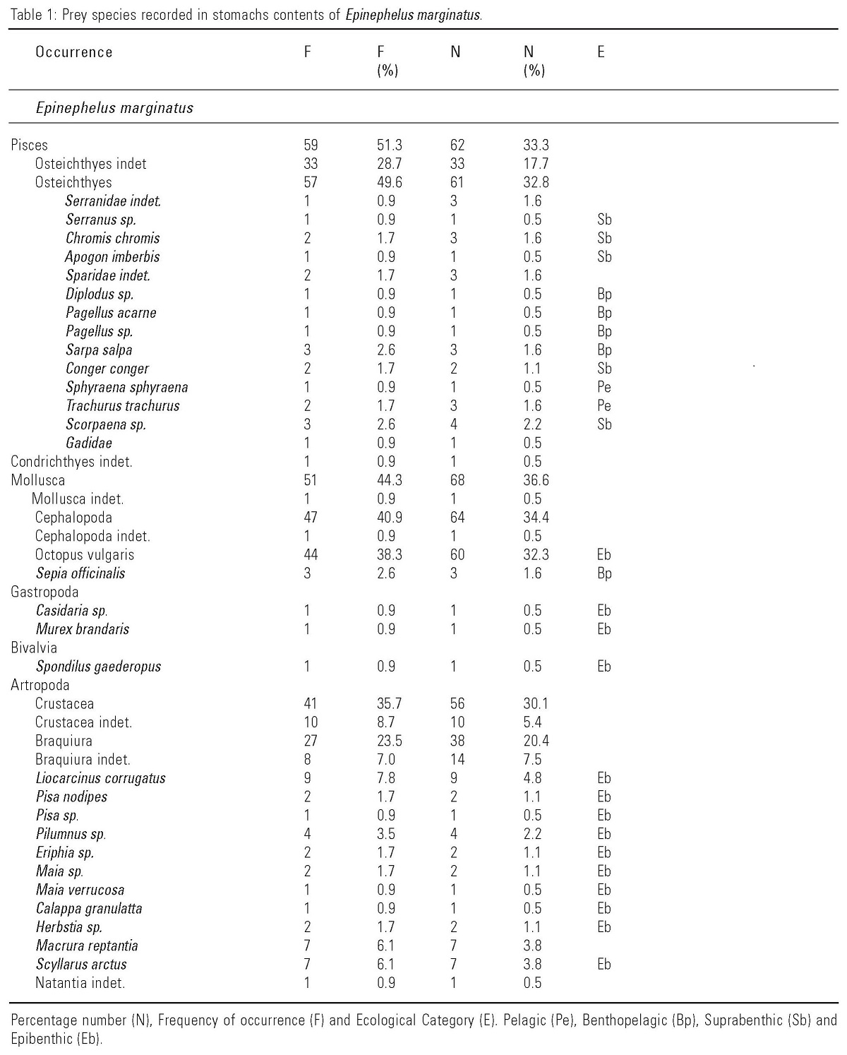 The results of this study are similar to those reported by Derbal and Kara (1996) for E. marginatus where they could identify some of the prey species reported in this study. They report the presence of Chromis chromis (Linnaeus), Maja sp., Scyllarus arctus and Octopus vulgaris. Also, there are other studies were O. vulgaris has been found to be a common component of the diet of E. marginatus (Cadenat, 1954; Chauvet, 1991; Derbal and Kara, 1996 and Barreiros and Santos, 1998).