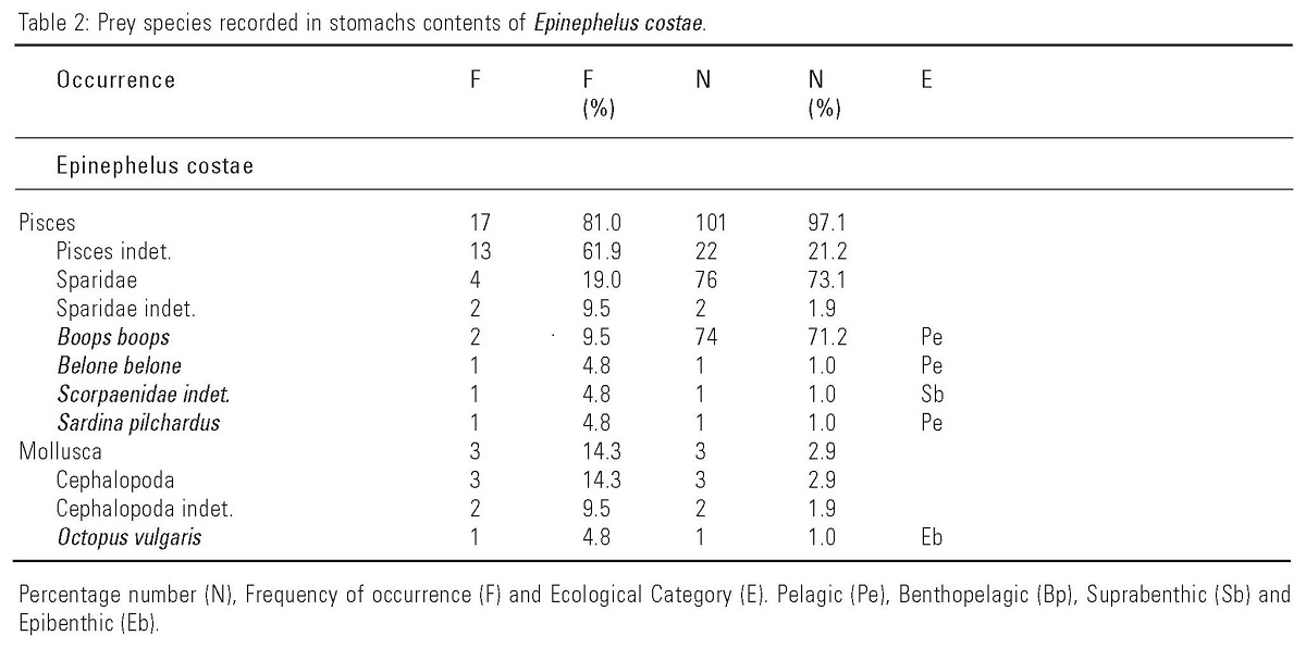 Different preys were observed for the goldblotch grouper, E. costae, were the main ecological category of preys was found to be pelagic. Based on direct observations of the great swimming capacity and a more elongated shape when compared with the dusky grouper, we can conclude that E. costae finds its preys mainly throughout the water column and prefers to feed from small size fish schools.