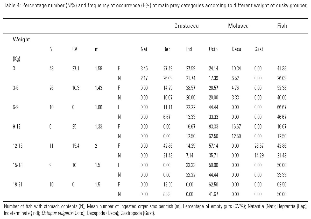 Results of present and previous studies indicate that E. marginatus is a predator fish that feeds on a large number of different species of fishes, mollusks and crustaceans. In conclusion, crustaceans are the smallest prey in relation to fish size and they are the most common prey of the small dusky grouper. As groupers reach increase in size they consume higher amounts of larger preys such as fishes and cephalopods.