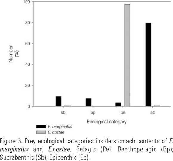 Epibenthic species were the main preys consumed by E. marginatus counting 79.7% of the total number followed by preys in the Suprabenthic category (9.3%). Pelagic and Benthopelagic preys represented 11% of the organisms consumed by this specie. The main preys for E. costae belong to pelagic ecological category with 97.4% of the total food con-sumed, followed by species related to the benthos (2.6%). The ecological categories for each prey are summarized in Tables 1 and 2.