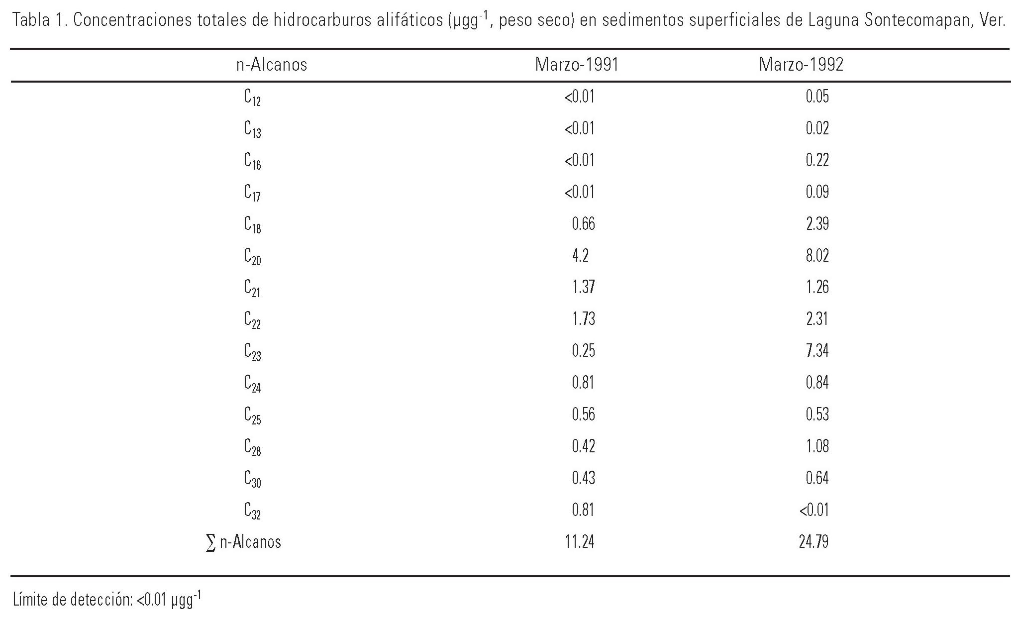 Las concentraciones de n-alcanos totales, en orden jerárquico para marzo de 1991 fueron: C20 (4.20 µgg-1) > C22 (1.73) > C21 (1.37) > C24 y C32 (0.81) > C18 (0.66).