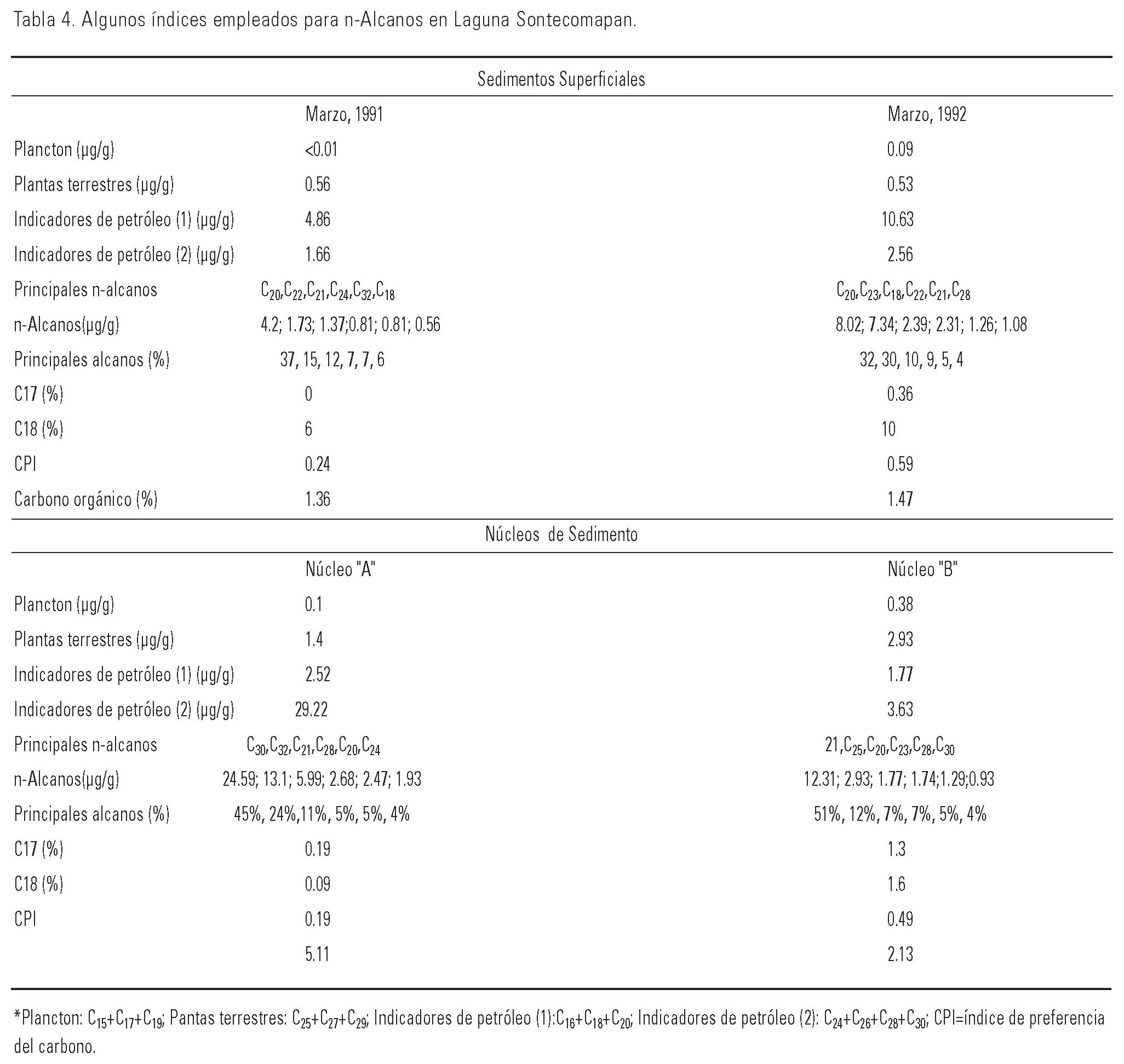 Las concentraciones promedio en particular del C18 en sedimentos superficiales para 1991 fueron de 0.33 µgg-1 y 1.2 µgg-1 para 1992, mientras que en los núcleos los valores fueron menores: núcleo "A" (0.1 µgg-1) y "B" (0.13 µgg-1). La proporción n-C17/nC18 obtenida en algunas de las muestras analizadas en el sistema de Sontecomapan, exclusivamente para la estación 4 (marzo, 1992), con un valor de 0.04 indica el dominio del C18, el cual se relaciona con una contribución reciente de hidrocarburos antropogénicos y que refleja la influencia limitada de la degradación microbiana.