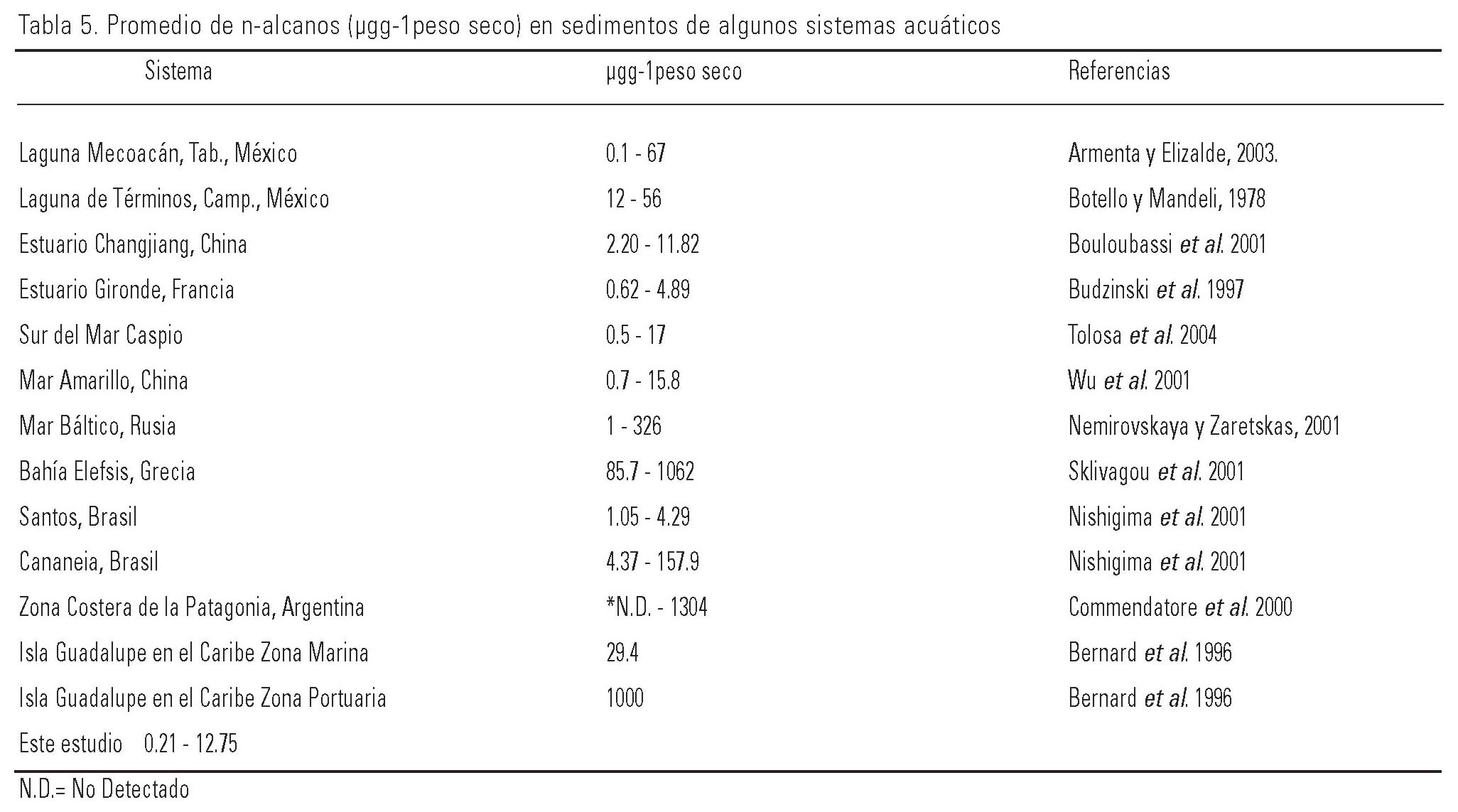 En general, son escasos los trabajos en estuarios sobre n-alcanos en sedimentos (Sharma et al. 2000; Bouloubassi et al. 2001) y en México destacan los reportados por Botello y Mandelli (1978); Botello et al. (1991); López et al. (1999) y Armenta y Elizalde (2003). A la fecha, el presente estudio es el único que se ha realizado en el sistema de Sontecomapan sobre hidrocarburos saturados.