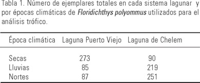 Se analizaron 445 ejemplares de la laguna Puerto Viejo (0.9 a 7.0 cm de LE) y 561 provenientes de la laguna de Chelem (1.1 a 9.0 cm de LE). El número de individuos analizados por época climática varió entre ambos sitios (Tabla 1); sin embargo, siempre fue mayor a 85 individuos, de los cuales para ambos sitios el 100% se encontraban con el estómago medio lleno o lleno.