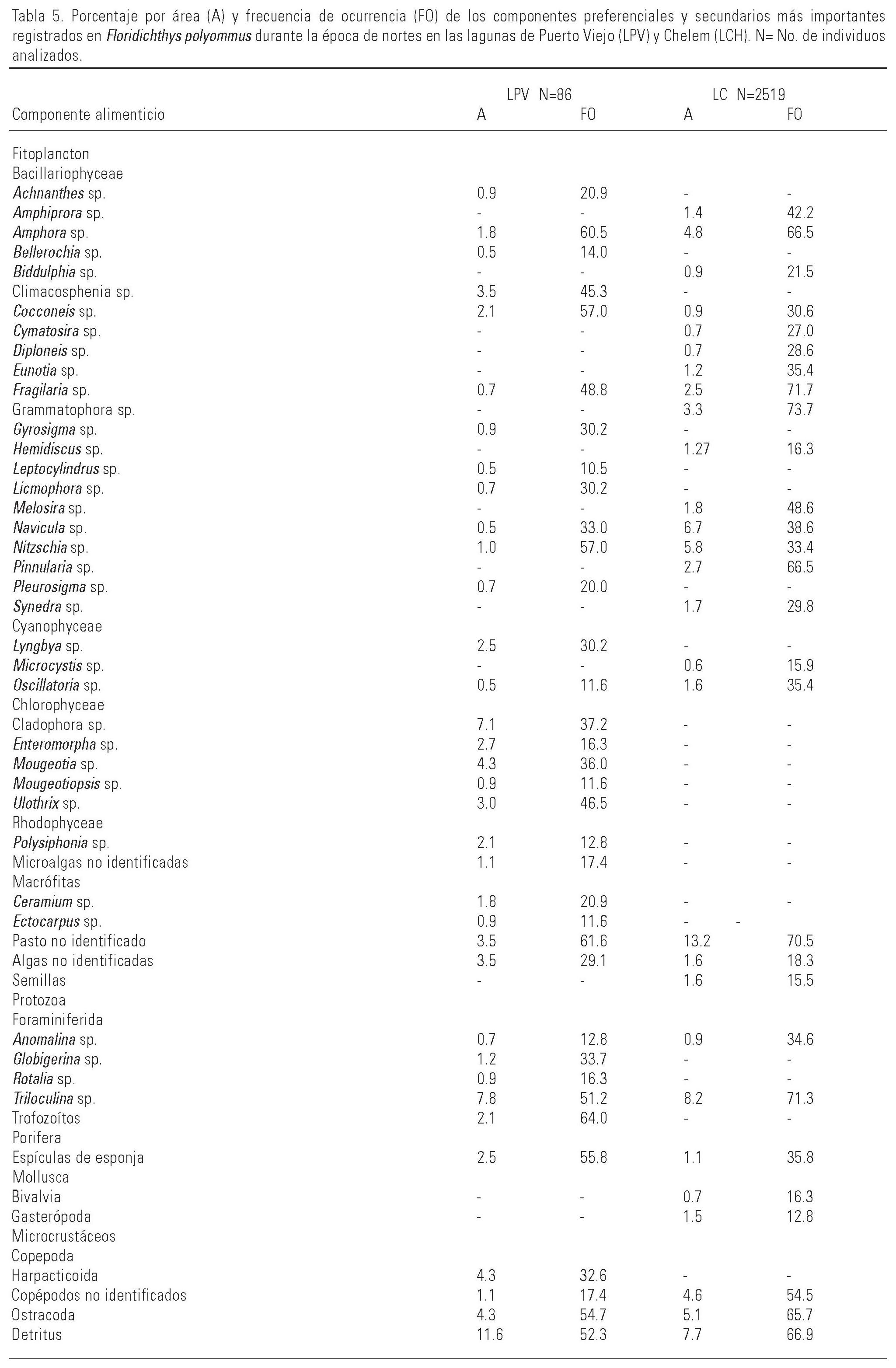 Los resultados obtenidos muestran que esta especie presenta un amplio grado de generalización trófica, incluyendo en su dieta 126 componentes alimenticios en la laguna Puerto Viejo y 80 en la laguna de Chelem. Los taxa identificados en los estómagos se agruparon en grupos tróficos para un mejor manejo. Como fitoplancton se consideraron a las bacilariofitas, clorofitas, cianofitas, rodofitas y microalgas que no pudieron identificarse. Dentro de los microcrustáceos quedaron comprendidos los anfípodos, copépodos, isópodos, ostrácodos, tanaidaceos, misidáceos y crustáceos no identificados. En los protozoarios se incluyeron los dinoflagelados, foraminíferos, oligotríquidos, trofozoítos y protozoarios no identificados. En los moluscos se agruparon los bivalvos, gasterópodos y poliplacóforos. Como macrófitas, se incluyeron algas y semillas de algas observables en el microscopio estereoscópico y pastos marinos. En los Porifera se incluyeron restos de esponjas y sus espículas. Se consideró como detritus al material alimenticio que debido a su consistencia, grado de digestión y presencia de arena sugiere que es materia orgánica en descomposición. Dentro de los Annelida se consideraron a los poliquetos. En Echinodermata se incluyó a la familia Ophiuroidea. En la categoría "otros" se incluyeron componentes cuya representatividad fue baja, tales como ácaros, huevecillos, larvas de insectos o insectos adultos, restos de peces o escamas, MANI (material animal no identificado) y MONI (material orgánico no identificado).