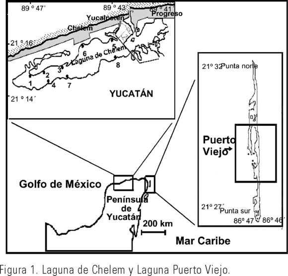 La laguna de Chelem se ubica al noreste de las costas del Estado de Yucatán, a 30 km. al norte de la ciudad de Mérida (21º15-17'N, 89º39-48' W). Tiene una superficie aproximada de 15 km2, y una longitud y anchura de 14.7 y 1.8 km, respectivamente. Presenta una boca artificial con 225 m de ancho y una profundidad que varía entre 0.5 y 1.5 m, excepto en la zona de la dársena, que alcanza los 3.0 m (Fig. 1).