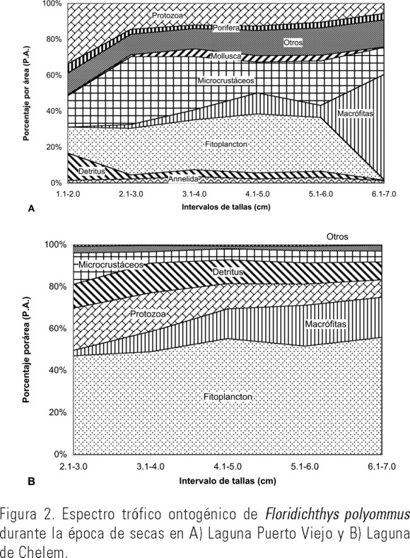 Secas. En la laguna Puerto Viejo se analizaron 273 ejemplares correspondientes a los meses de abril y junio, con tallas de 1.0 a 7.0 cm de LE. Los grupos tróficos más abundantes en la dieta durante esta época del año fueron los microcrustáceos (35.1%), fitoplancton (22.5%), protozoarios (15.0%) y detritus (8.6%) (Tabla 2). Los componentes preferenciales (FO>50%) fueron 4 y los secundarios 27 con FO de 10.3% a 48.4% (Tabla 3). El resto de los componentes alimenticios con FO por debajo del 10% se consideraron como accidentales (80 componentes). Durante el crecimiento de esta especie en la época de secas, los ejemplares más pequeños (1.1-2.0 cm de LE) consumen principalmente protozoarios (33.7%) y microcrustáceos (17.4%), conforme aumentan de talla (2.1-3.0 cm a 5.1-6.0 cm de LE), el espectro trófico cambia hacia un mayor consumo de fitoplancton (32.7%) y microcrustáceos (37.8%). En los individuos con intervalo de tallas de 6.1-7.0 cm, el consumo de macrófitas en la dieta fue casi del 60%, lo cual indica una tendencia de esta especie a ser especialista en esta etapa de su ontogenia durante esta época del año (Fig. 2A).