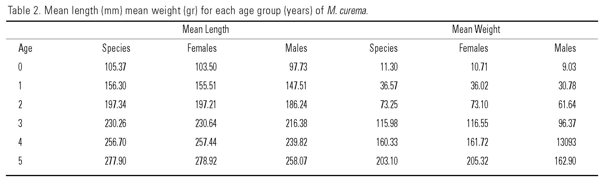 The calculated curve that best fitted the observed values through scales corresponded to the parameters calculated with the Prager (1987) method. The calculated values of the length for different ages were obtained by using these parameters (Table 2) which in general showed improved calculated values. Figure 1 shows the theoretical growth curve for M. curema ages 0 to 5 years. A high increase in length was recorded during the first year, after which growth decreased markedly. Size increased by 50.93 mm TL between zero and first years; 41.04 mm between first and second years; 32.92 mm between second and third years; 26.44 mm between third and fourth years and 21.20 mm between fourth and fifth years. The decrease in growth after the first year on must be related to the first sexual maturity which occurs at 200 mm of total length (Cabral-Solís, 1999). Prager method (1987) was applied for growth determination between sexes because it presented the best fit for the growth calculation parameters of the species. The values of the von Bertalanffy growth equation are shown in Table 3. The k value in males was higher than in females, therefore males will reach L∞ faster than females and the growth curve is more convex. Although differences of k value in males and females are very small, the mean length and mean weight at a same age are considerably higher in females than in males, so the L∞ parameters define the growth differences between sexes (Table 2). The result from the multivariate analysis showed that females and males grow differently. The calculated value of T2 (22.18) is considerably higher than the tabulated value of T2 (11.71; P<0.01).