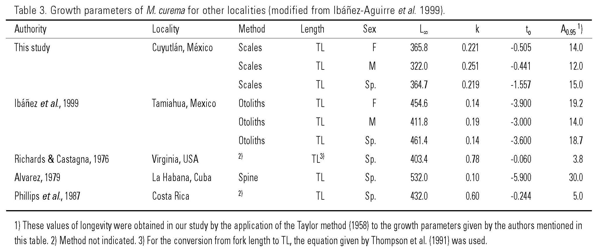 The values of the parameters of the von Bertalanffy growth equation for M. curema are shown in Table 3. The k values calculated in this study are higher than the reported by Ibáñez-Aguirre et al. (1999) and Alvarez (1979), but are lower than the reported by Richards and Castagna (1976) and Phillips et al. (1987). In general, the values of the relationship between length and weight in this study are similar to those presented by Angell (1973 = 2.84), Richards and Castagna (1976 = 2.90) and Ibáñez-Aguirre et al. (1999 = 2.75 and 2.94). The values of longevity for M. curema in different areas are shown in Table 3. The highest value was obtained by Alvarez (1979), i. e. 30 years in Cuba; the lowest values by Richards and Castagna (1976) 3.8 years in Virginia and Phillips et al. (1987) 5 years in Costa Rica. The longevity values in this study are lower than those of Tamiahua Lagoon, because as Taylor (1958 and 1960) has shown, latitude, temperature, longevity and L∞ have a direct proportional relation, while the k has an indirect proportional relation to the latitude and temperature. The temperature in Tamiahua lagoon goes from 10.3º C to 33º C (Ibañez-Aguire, 1995) and in Cuyutlan lagoon from 17.5º C to 34.2º C.(Cabral-Solís, 1999).