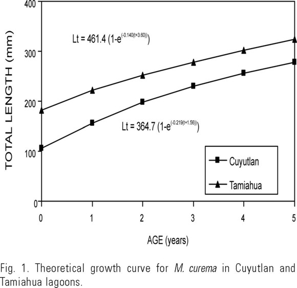 Mugil curema (Valenciennes) is basically an American specie found from Cape Cod, USA to Brazil in the Atlantic Ocean and from Bahia Magdalena, Mexico to Chile in the Pacific Ocean (Jordan & Everman, 1896). However, Alvarez (1976) has recorded M. curema off the western coast of Africa. The M. curema fishery has the 21st place in national importance in Mexico, the yearly catch of this mullet in 1999 was 7,282 metric tons. The commercial catch of white mullet in the Gulf of Mexico represents 97% (7,062 ton) and in the Pacific Ocean 3% (219 ton) (SEMARNAP, 2000). In the Pacific, 44.7 % (98 ton) is obtained in the coast of Colima State and 55.3 % (121 ton) in Chiapas state (SEMARNAP, 2000). In the Cuyutlan Lagoon M. curema price ranges between 2 and 3 mexican pesos per kg. This activity gives employment to 400 fishermen (Cabral-Solís, 1999). Although this species represents an important food source in several countries, there are few studies on its ecology and population dynamics. Some parameters of their dynamics were analyzed by Angell (1973), Alvarez (1976, 1979 and 1981), Richards and Castagna (1976), Phillips et al. (1987), Pérez-Garcia and Ibáñez-Aguirre (1992), Ibáñez-Aguirre and Lleonart (1996), Ibáñez-Aguirre and Gallardo-Cabello (1996 a and b) and Ibáñez-Aguirre et al. (1999). The purpose of the present work is to propose a complete analysis on the growth characteristics of M. curema with regards to the length, weight, sex and longevity in the Cuyutlan Lagoon, Mexico.