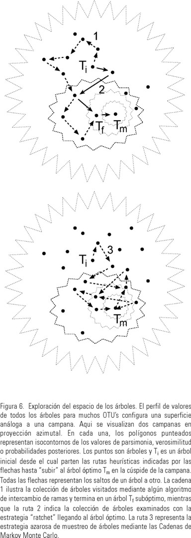 Los primeros esfuerzos de exploración bajo modelos de parsimonia se basaron en la derivación de cadenas heurísticas a partir de muchos árboles iniciales elegidos al azar (Fig. 6). En cada réplica se explora un "sector" (o "isla") del espacio a partir de un árbol inicial (Ti, Fig. 6) y se visita una cadena de árboles vecinos a los que se llega mediante diferentes algoritmos para el intercambio de ramas (nni, spr, tbr, sensu Kitching et al., 1998, p 45-48). Una cadena de árboles se detiene en el óptimo local cuando ya no se disminuye la longitud de los árboles. Tradicionalmente, para maximizar la posibilidad de encontrar el óptimo global, se replica el esfuerzo de exploración de varios sectores generando cientos de cadenas a partir de igual número de puntos al azar en el espacio. Los programas disponibles (PAUP, Hennig86, NONA, TNT, etc.) permiten evaluar muchas réplicas. Cuando el número de taxa es mayor a 40 o 50, la primera réplica puede tomar demasiado tiempo de computo. En este caso, se idearon maneras de cómo limitar el esfuerzo local en la primera cadena de árboles para favorecer el esfuerzo de exploración global mediante varias réplicas concatenadas (Soltis & Soltis, 1996).