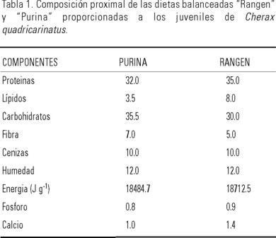 El balance energético de los juveniles de C. quadricarinatus se evaluó en organismos aclimatados a dos regímenes de temperatura y alimentados durante 30 días con dos dietas Bagrina de Purina con un contenido proteínico del 32% y Camaronina de Rangen con 35% de proteína (Tabla I), mediante la siguiente ecuación modificada de Klekowski & Duncan (1975):