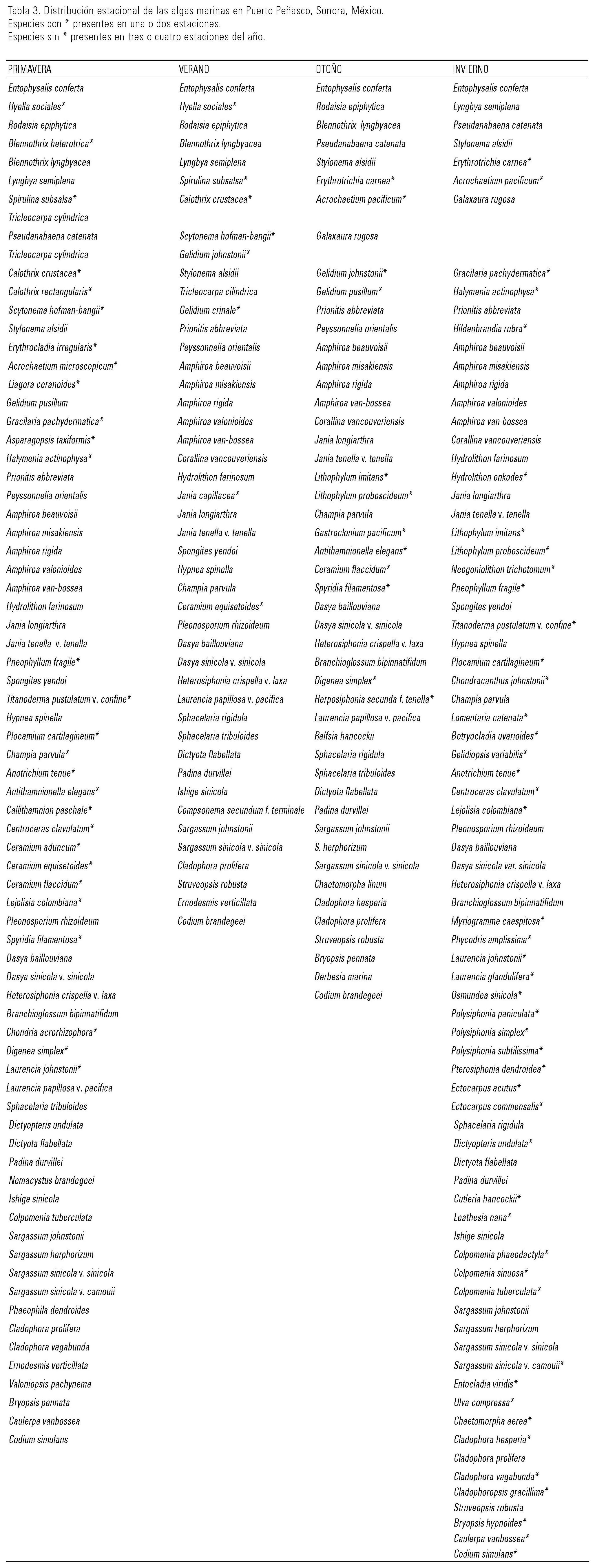 Estudios previos en áreas adyacentes muestran que las condiciones climáticas del Golfo son muy variables y que la temperatura del agua va de 15 °C en diciembre-enero a 29 °C en julio-agosto (Álvarez-Borrego et al., 1975) lo cual incide directamente en la variación estacional de las algas marinas (Pacheco-Ruíz & Zertuche-González, 1996a, 1996b; Mateo-Cid et al., 1993, 2000). Esa estacionalidad se observó con una mayor diversidad en diciembre con 78 taxa y menor en septiembre con 39 especies (Tabla 3). La mayoría de las plantas desaparecieron durante septiembre y las que se encontraron estaban severamente dañadas. Este comportamiento en la variación estacional de las algas marinas es provocado por el incremento de la temperatura del agua de mar que alcanza hasta 29 °C. Varias especies fueron localizadas sólo en una estación del año, especialmente en diciembre y junio (Tabla 3). Este patrón de estacionalidad corresponde a aquellos previamente observados en el Golfo de California, caracterizados por la amplia variación de especies encontradas de estación a estación (Littler & Littler, 1981, 1984; Espinoza-Avalos, 1993; Aguilar-Rosas et al., 2000; Mateo-Cid et al., 1993). La correlación inversa entre la temperatura y la diversidad de especies ha sido considerada un patrón común en el Golfo de California (Norris, 1975; McCourt, 1984; Huerta-Múzquiz & Mendoza-González, 1985; Pacheco-Ruíz et al., 1992; Aguilar-Rosas et al., 2000).