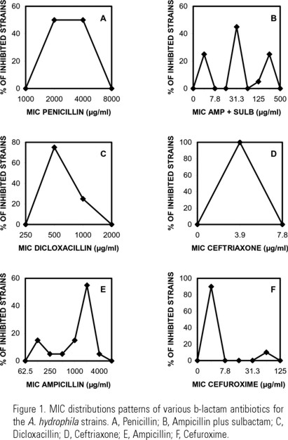 Chirostoma humboldtianum is an endemic Mexican fish, widely consumed by low-statuses Mexican people, for which no microbiological studies have been published. We have found that these fishes harbored β-lactamase producer A. hydrophila strains resistant to penicillin, dicloxacillin, and ampicillin (Fig. 1 A, C, E). Since ampicillin MIC was 75-99.9% lowered by sulbactam (Fig. 1B) these results suggest us that β-lactamases produced by the strains probably are conventional spectrum enzymes, which do not confer resistance to cephalosporins (Payne et al., 1994). This conclusion was further supported by the ceftriaxone and cefuroxime susceptibility of the strains (Fig. 1 D, F). These results are similar to those found by Castro-Escarpulli et al. (2003) for 82 Aeromonas spp. strains isolated from frozen tilapia (Oreochromis niloticus niloticus) purchased in local markets of Mexico City; all strains were resistant to penicillin and ampicillin, but sensitive to cefuroxime.