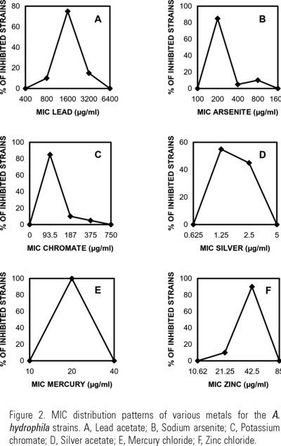 All strains were resistant to lead (MIC=800-3200 µg/ml, Fig. 2A) and susceptible to chromate (MIC≤ 375 µg/ml), silver (MIC≤ 2.5 µg/ml), mercury (MIC=20 µg/ml) and zinc (MIC≤ 42.5 µg/ml) (Fig. 2 C-F). Susceptibility to arsenite showed a bimodal MIC distribution with a peak of 15% resistant strains (MIC=400-800 µg/ml), and 85% of them susceptible (MIC=200 µg/ml Fig. 2B).