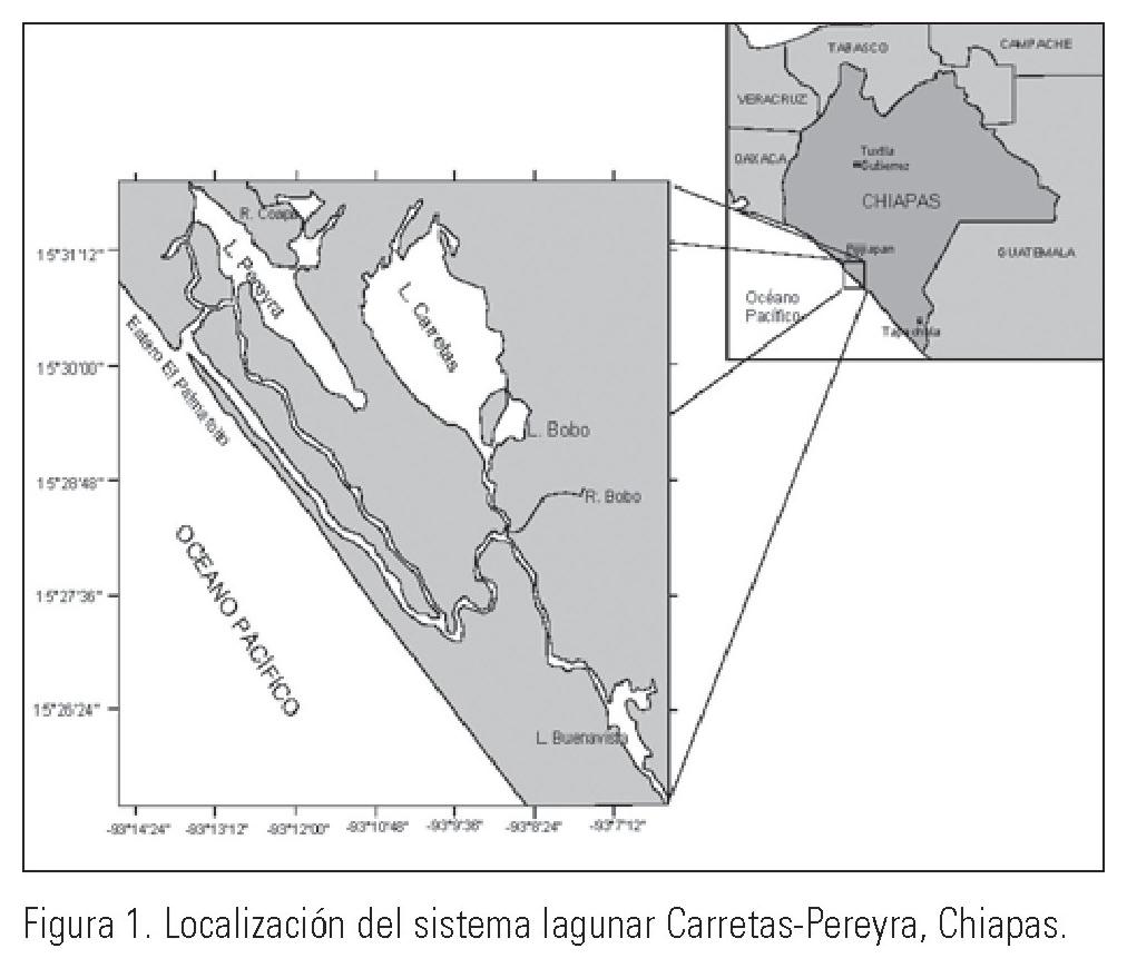En la Planicie Costera de Chiapas, se encuentra el sistema lagunar Carretas-Pereyra (Fig. 1), el cual se localiza en el municipio de Pijijiapan, en la porción central de la costa de Chiapas con una extensión de 3690 hectáreas. Se caracteriza por tener un alto valor biológico por su diversidad de flora y fauna; así mismo, presenta una actividad pesquera vital para el desarrollo social y económico de los habitantes de la zona costera de Chiapas (Secretaria de Pesca, 1990). Por tal motivo la Reserva de la Biósfera "La Encrucijada", la Universidad Autónoma Metropolitana Iztapalapa (UAMI), Ecosur y otras instituciones públicas y privadas han desarrollado una serie de investigaciones en estas lagunas.