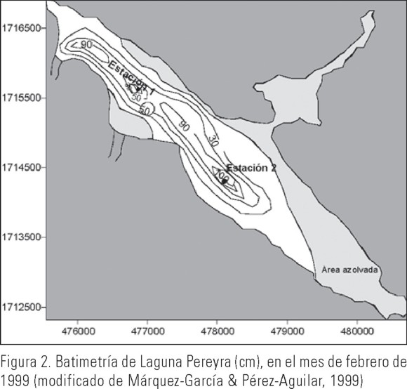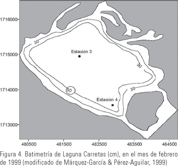 La medición de la profundidad en las estaciones de monitoreo se efectuó con regleta o estadal topográfico implementado en una base circular de 10 cm; la posición geográfica de las estaciones se estableció con un Sistema de Posicionamiento Global (GPS). La profundidad fue referida localmente al máximo embalse de las lagunas observado en el sitio cuya cota promedio fue de 4.5 m según el GPS y un altímetro. Este valor se consideró como el nivel de cero profundidad. Se hicieron las correcciones por nivel y por mareas (Instituto Cubano de Hidrografía, 1979). Para ello, se estimó un régimen de mareas mixto semidiurno con una hora de bajamar y pleamar casi simultánea para toda la zona (De la Lanza, 1991), la marea estimada en la Boca Palmarcito presentó una amplitud media de 1.25 m (SEMARNAP, 2001) y de 0.40 m en la laguna Carreta.