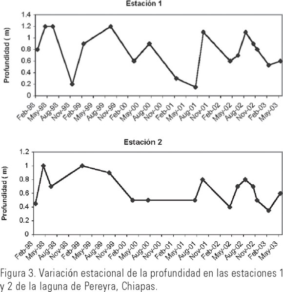 Laguna Pereyra. La estación 1 de monitoreo esta situada al noroeste de la laguna sobre el canal interno (Fig. 2), la profundidad medida en este sitio (Fig. 3a) presentó el siguiente comportamiento, en febrero de 1998, en época de secas fue de 0.80 m hasta llegar a 1.20 m en lluvias de ese mismo año. Una disminución drástica de la profundidad se registró en octubre de 1998, alcanzando los 0.20 m, causada por el azolve de sedimentos aportados de la cuenca a la laguna, inmediatamente después de las altas precipitaciones registradas en septiembre de 1998, estimadas en 1200 mm en tan sólo cinco días (SEMARNAP, 2001).