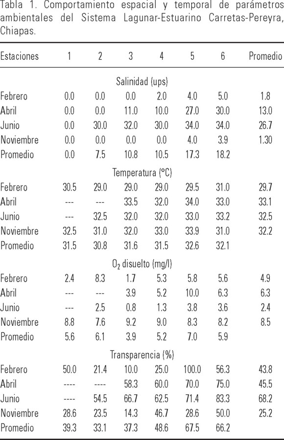 Parámetros Fisicoquímicos. Carretas-Pereyra: las variaciones espacio-temporales de los parámetros físico-químicos en esta laguna se resumen en la Tabla 1. La salinidad promedio más alta del sistema se registró en las estaciones 5 y 6 con valores de 17.3 ups y 18.2 ups, respectivamente; mientras que en la estación 1 siempre se determinaron valores de 0.0. En escala temporal el valor promedio más alto se registró en junio con 32 ups, y el más bajo en noviembre con 1.3 ups, ambos meses de la temporada lluviosa. El ANOVA indico diferencias entre los meses analizados, la prueba de Tukey señaló que fueron entre febrero-abril (p= 0.001), febrero-junio (p= 0.0002), abril-noviembre (p= 0.005) y junio-noviembre (p= 0.0004). Este sistema es somero con valores promedio de profundidad de 0.71 m (febrero) a 1.03 m (noviembre), está influenciado principalmente por la descarga de agua dulce de los ríos locales. La temperatura del agua presentó los valores promedio más altos en la estación 5 con 32.6 °C, y los más bajos en la estación 2 con promedio de 30.8 °C. En los meses de estudio la temperatura promedio fue mayor en junio con 32.5°C y menor en febrero con 29.7°C. El ANOVA y la prueba de Tukey indicaron diferencias entre febrero-abril (p= 0.0002), febrero-junio (p= 0.0004) y febrero-noviembre (p= 0.0007). El oxígeno disuelto promedio más alto se registró en la estación 5 con 7.0 mg/l, y el más bajo en la estación 3 con 3.9 mg/l. El valor promedio anual más alto, fue registrado en noviembre con 8.5 mg/l y él más bajo en junio con 2.4 mg/l. El ANOVA y la prueba de Tukey señalaron diferencias entre febrero-noviembre (p= 0.015), abril-junio (p= 0.024) y junio-noviembre (p= 0.0003). La transparencia de la columna de agua varió en el sistema durante los meses de estudio, de 21 a 100%. El ANOVA no indico diferencias entre los meses analizados.