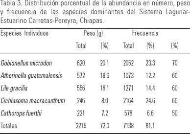 Especies Dominantes. Carretas-Pereyra: en este sistema lagunar el análisis de abundancia numérica, peso y frecuencia mostró que las especies dominantes de la comunidad fueron: Gobionellus microdon (Gilbert, 1891), Atherinella guatemalensis (Günther, 1864), Lile gracilis (Castro Aguirre & Vivero, 1990), Cichlasoma macracanthum (Günther, 1864) y Cathorops fuerthi (Steindachner, 1875), las cuales representaron el 72% de la abundancia numérica, el 81% de la captura total en peso y con las frecuencias más altas del sistema (Tabla 3).