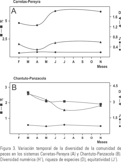 Variación espacio-temporal de Diversidad. El análisis de la diversidad numérica (H') y la riqueza de especies (D) para los sistemas lagunares Carretas-Pereyra y Chantuto-Panzacola, mostró que las variaciones espaciales y temporales son pequeñas, no obstante, están relacionadas con las condiciones hidrológicas, los ambientes presentes en el sistema y con las condiciones ambientales prevalecientes en cada época del año.