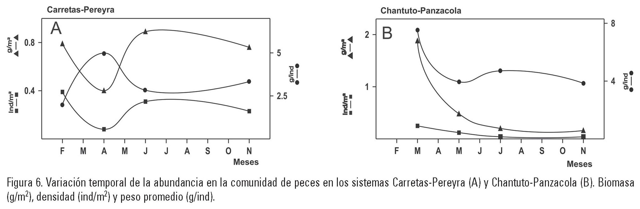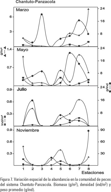 Chantuto-Panzacola: la figura 7 muestra el comportamiento de los parámetros de abundancia del sistema. Los valores más altos de biomasa y densidad se registraron en la estación 8 con 7.63 g/m2 y 0.96 ind/m2 (marzo). El peso promedio de los peces presentó su valor máximo en la estación 3 con 20.4 g/ind en marzo. Sin embargo, durante noviembre se observa un valor máximo de 88.7 g/ind en la estación 8, debido a la captura de un individuo en ese mes. En las estaciones 1, 3, 4, y 8 se registraron valores cero, debido a que no se capturaron individuos en algunos meses de muestreo. Comparando estos tres parámetros entre los meses de muestreo, se observa que los valores más altos se registraron en marzo (secas) con 1.88 g/m2, 0.25 ind/m2 y 7.55 g/ind, respectivamente. Los valores más bajos se presentaron en noviembre (lluvias) con 0.16 g/m2, 0.04 ind/m2 y 3.85 g/ind (Fig. 6B). El ANOVA, no indicó diferencias entre los meses analizados para los parámetros antes descritos (p > 0.05).