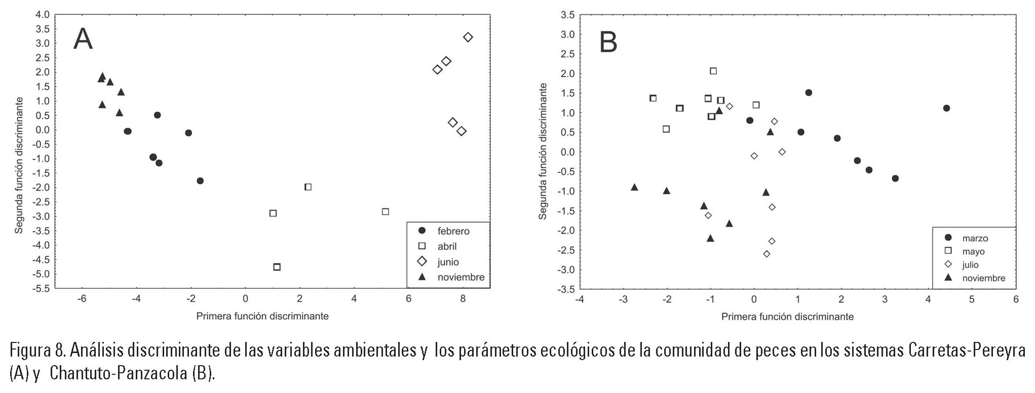 Análisis Discriminante. Carretas-Pereyra: el análisis múltiple mostró que la salinidad (Lambda de Wilks 0.1710; p= 0.000005), el oxígeno (Lambda de Wilks 0.4657; p= 0.0080) y la temperatura (Lambda de Wilks 0.4671; p= 0.0082) fueron significativas en el modelo. La correlación canónica para las variables incluidas fue r = 0.972. La matriz de clasificación de las observaciones para las variables canónicas incluidas indicó que el 100% fueron correctamente clasificadas. La figura 8A muestra la distribución de observaciones correspondientes en función del espacio discriminante entre la primera y segunda función, siendo su variación acumulada de 87% y 12%, respectivamente. De acuerdo con los valores de los coeficientes estandarizados para las variables canónicas, el peso individual de ellas para la primera función canónica fueron: salinidad (-1.093), oxígeno disuelto (0.808) y temperatura (-0.037). Para la segunda función fueron: temperatura (0.904), oxígeno (0.345) y salinidad (-0.0938).