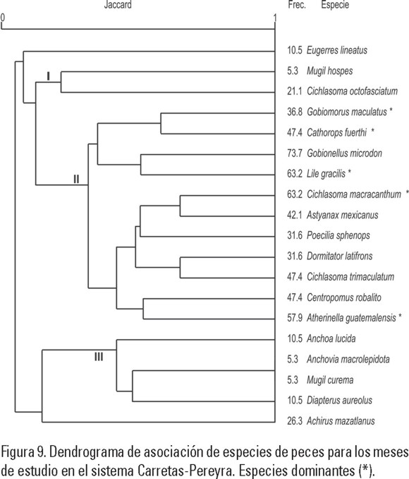 Conjuntos Ictiofaunísticos. Carretas-Pereyra: en este sistema lagunar-estuarino se aprecia la formación de tres conjuntos de peces a niveles bajos de similitud (Fig. 9). En los grupos I y III se incluyen especies principalmente del componente marino con frecuencias intermedias a muy bajas y en la mayoría de los casos con distribución restringida y presencia sólo en alguno de los meses de muestreo, como: Achirus mazatlanus, Anchoa lucida (Jordan & Gilbert, 1882), Anchovia macrolepidota (Kner & Steindachner, 1865), Diapterus aureolus (Jordan & Gilbert, 1882). En el conjunto II se agrupan las especies más frecuentes y abundantes, donde quedan incluidas las especies dominantes (Tabla 3). Este conjunto agrupa a 11 especies y se divide en dos subgrupos, uno con 4 especies principalmente del componente estuarino como Gobiomorus maculatus, Cathorops fuerthi, Gobionellus microdon y Lile gracilis. Otro grupo está formado con 7 especies en su mayoría del componente dulceacuícola que se distribuyen preferentemente en áreas de manglar al final de la época de lluvias cuando la salinidad ha disminuido (1.3 ups) como Cichlasoma macracanthum, Astyanax fasciatus (Cuvier, 1819), Poecilia sphenops (Valenciennes, 1846), Cichlasoma trimaculatum y Atherinella guatemalensis. El registro de especies en el año, mostró que en junio y noviembre se capturaron 15 especies respectivamente, mientras que en febrero y abril fueron 13 y 6 especies, encontrándose variación en la abundancia de las especies dominantes en estos meses.