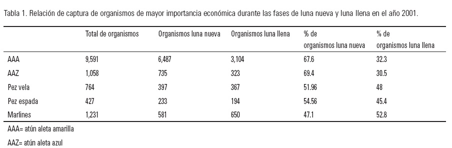 En orden de importancia en número de organismos capturados, el AAA fue seguido por los marlines, AAZ, pez vela y pez espada durante la fase de luna nueva. En fase de luna llena el AAZ sustituyó a los marlines en el segundo lugar (Tabla 1).