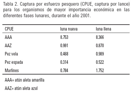 La CPUE anual para el pez vela, pez espada y el grupo de los marlines (Tabla 2) fue mayor durante luna llena, en cambio para los atunes la CPUE fue solo ligeramente mayor en luna nueva.