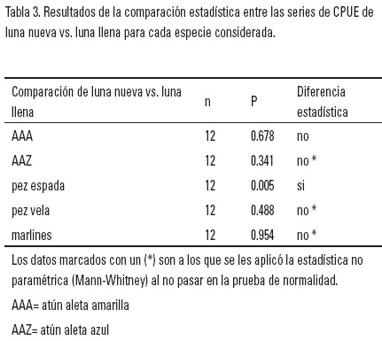 Tras someter los datos de CPUE mensual a las pruebas de normalidad y efectuar las pruebas de comparación de las series de valores, se encontró que de las cinco especies analizadas sólo el pez espada presentó diferencias significativas al comparar la fase de luna nueva con la de luna llena (Tabla 3).
