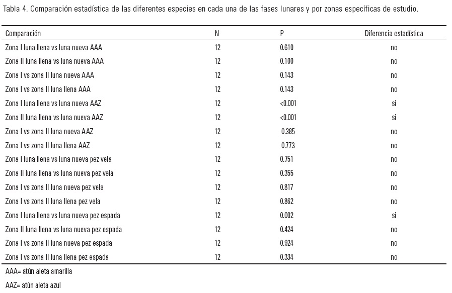La CPUE para AAZ mostró diferencias estadísticas tanto para la zona I como para la zona II, al comparar las series luna llena vs. luna nueva. En el caso del pez espada se encontró una diferencia estadística significativa (Tabla 4) para la zona I en la comparación entre las fases de luna nueva y de luna llena. Para ninguna de las otras series se encontraron diferencias significativas (Tabla 4).